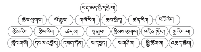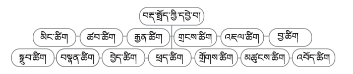 ༡ དད་པ་རྨང་གཞི་བྱས་པའི་དགེ་སྒྲུབ་སྡིག་སྤོང་གི་རྣམ་གཞག་ཆོས་ལུགས་ཀྱི་བརྡ་ཆད། ༢ རང་བྱུང་ཁམས་དང་མིའི་རིགས་ཀྱི་སྤྱི་ཚོགས་བྱུང་འཕེལ་རིམ་པ་བཀོད་པའི་བྱུང་བ་ལོ་རྒྱུས་ཀྱི་བརྡ་ཆད། ༣ སེམས་དང་ཚེ་སྲོག་རང་བྱུང་ཁམས་སོགས་ཀྱི་ཆོས་ཉིད་ལ་དཔྱད་པ་ལྟ་གྲུབ་ཀྱི་བརྡ་ཆད། ༤ ཟློས་གར་དང༌། སྙན་ངག བརྩམས་སྒྲུང་། ལྷུག་རྩོམ་བཅས་ཀྱི་རྣམ་གཞག་སྟོན་པ་རྩོམ་རིག་གི་བརྡ་ཆད། ༥ ལུས་ཀྱི་འབྱུང་ཁམས་མ་སྙོམས་པ་རྣམས་སྙོམས་པར་བྱེད་པའི་རྣམ་གཞག་གསོ་རིག་གི་བརྡ་ཆད། ༦ དམིགས་བསལ་གཞུང་དང༌། དེ་བཞིན་ཚོགས་པ་སྒྲིག་འཛུགས་ཁག་གི་སྲིད་དོན་ཁེ་ཕན་དང་འབྲེལ་བའི་རྣམ་གཞག་ཆབ་སྲིད་ཀྱི་བརྡ་ཆད། ༧ བརྟག་དཔྱད་དང་ཚོད་ལྟ་བརྒྱུད་ནས་རང་བྱུང་གཤིས་ལུགས་དང་དངོས་ཁམས་སོགས་ཀྱི་བདེན་པ་ཁུངས་སྐྱེལ་བྱེད་པའི་རིག་པའམ་རྣམ་གཞག་ཚན་རིག་གི་བརྡ་ཆད། ༨ མི་རྣམས་ཀྱི་རྣམ་དཔྱོད་ལ་བརྟེན་ནས་འཚོ་བའི་དགོས་མཁོ་དང་སྒྱུ་རྩལ་མཚོན་ཐབས་ཀྱི་ཆེད་དུ་གསར་སྐྲུན་བྱས་པའི་ཅ་དངོས་བཟོ་བཀོད་ཀྱི་རྣམ་གཞག་བཟོ་རིག་གི་བརྡ་ཆད། ༩ དབྱིབས་དང་གྲངས་ཀའི་རྣམ་གཞག་དང་། ཉི་ཟླ་གཟའ་སྐར་དང་། ལོ་ཟླ་སྤར་སྨེ་སོགས་ཀྱི་འཁོར་འགྲོས་ངེས་ཅན་ལ་བརྟེན་ནས་དུས་བཞིའི་དབྱེ་བ་དང་གནམ་གཤིས་ཀྱི་འགྱུར་ལྡོག་ལེགས་ཉེས་བླང་དོར་སོགས་ཤེས་ཐབས་ཀྱི་རྣམ་གཞག་རྩིས་རིག་གི་བརྡ་ཆད། ༡༠ རྒྱལ་ཁབ་བམ་སྤྱི་ཚོགས་ཤིག་གི་མི་ཚང་མས་བརྩི་བཀུར་རམ་དང་ལེན་དགོས་པའི་སྒྲིག་ལམ་ཁྲིམས་ལུགས་ཀྱི་བརྡ་ཆད། ༡༡ དཔལ་འབྱོར་གྱི་ལྟ་གྲུབ་དང། གཞུང་ལུགས་ཁག་སོགས་གཙོ་བོར་བསྟན་པའི་རིག་པ་དཔལ་འབྱོར་རིག་པའི་བརྡ་ཆད། ༡༢ རྒྱལ་ཁབ་ཀྱི་དམག་གི་སྒྲིག་འཛུགས་དང་བཀོད་བྱུས་ཀྱི་རྣམ་གཞག་དམག་དོན་རིག་པའི་བརྡ་ཆད། ༡༣ སྲིད་གཞུང་གིས་མང་ཚོགས་ཀྱི་ལས་དོན་བཀོད་བྱུས་བྱེད་ཐབས་འཛིན་སྐྱོང་གི་བརྡ་ཆད། ༡༤ སྐད་ཡིག་གི་འབྱུང་ཁུངས་དང་ངོ་བོ་འཕེལ་རྒྱས་སོགས་དཔྱོད་བྱེད་ཀྱི་རིག་པ་སྒྲ་རིག་པའི་བརྡ་ཆད། ༡༥ མིའི་ནུས་པ་དང་ཤེས་ཡོན་གོང་འཕེལ་གྱི་ཆེད་དུ། སློབ་གྲྭ་སོགས་ནས་བླང་དོར་འཇུག་ལྡོག་ལ་མི་རྨོངས་པའི་བསླབ་པ་སློབ་གཉེར་ལ་འཇུག་པའི་བྱ་གཞག་ཤེས་ཡོན་ནམ་སློབ་གསོའི་བརྡ་ཆད། ༡༦ བདེན་དོན་དང་གནས་ལུགས་འཚོལ་ཆེད་གཏན་ཚིགས་ཀྱི་རྣམ་གཞག་བཀོད་པའི་རིག་པ་ཚད་མའི་བརྡ་ཆད། ༡༧ ས་རྡོ་རི་བྲག་སོགས་ཀྱི་ཐོག་མའི་གྲུབ་ཚུལ་དང་འཕེལ་རིམ་སོགས་ཡང་དག་པའི་དཔྱད་ཐབས་ལ་བརྟེན་ནས་གཏན་ལ་འབེབས་བྱེད་ཀྱི་རྣམ་གཞག་སྟོན་པའི་གཞུང་ལུགས་ཀྱི་ཐུན་མིན་ཆེད་སྤྱོད་ཐ་སྙད་ས་རྒྱུས་སམ་ས་གཤིས་རིག་པའི་བརྡ་ཆད། ༡༨ སྤྱི་ཚོགས་ཀྱི་ངོ་བོ་དང་འཕེལ་རིམ་ཀུན་སྤྱོད་སོགས་ཡང་དག་པའི་དཔྱད་ཐབས་ལ་བརྟེན་ནས་གཏན་ལ་འབེབས་བྱེད་གཞུང་ལུགས་ཀྱི་ཐུན་མིན་ཆ